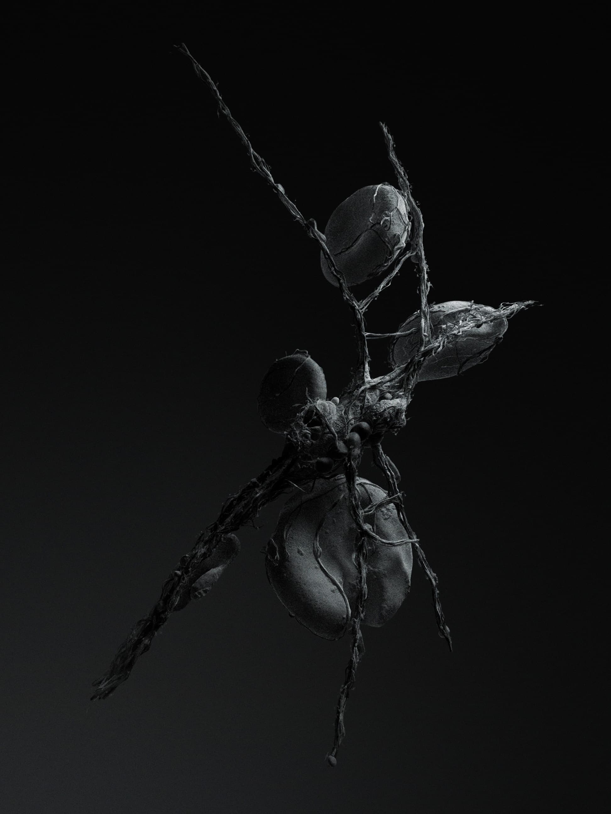 Chemicals depicts a journey through a microscopic neural world as a surge of serotonin hits the brain. Travelling through this microscopic universe, the atmosphere is dark and cavernous, only lit by pulses of energy through the organic structures. The organism’s surfaces are rich and organic, as if they are being observed under a Scanning Electron Microscope.