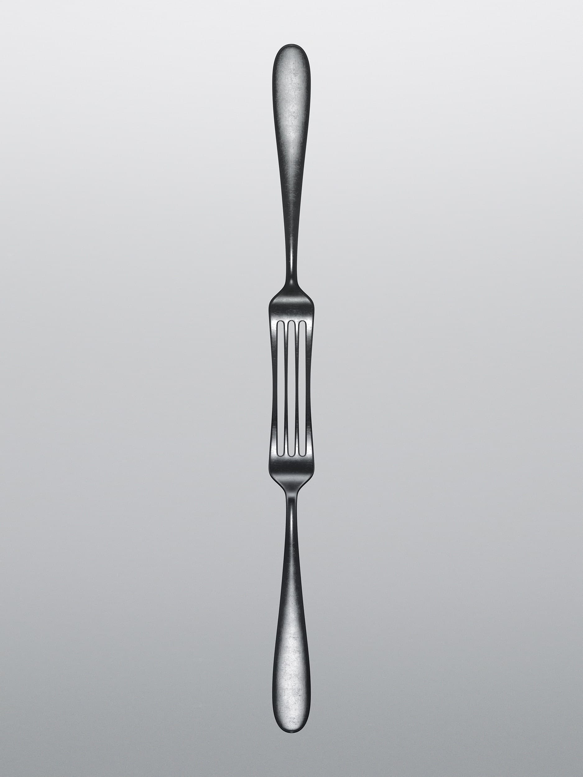 In a museum, a woman looking at a Fork exhibited as a piece of Art lets her imagination run wild.