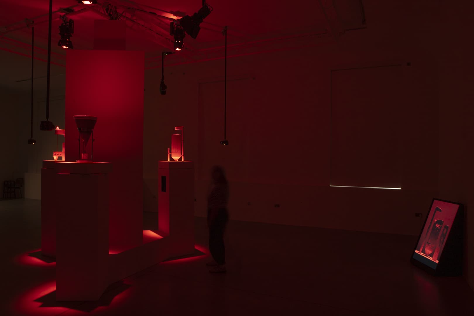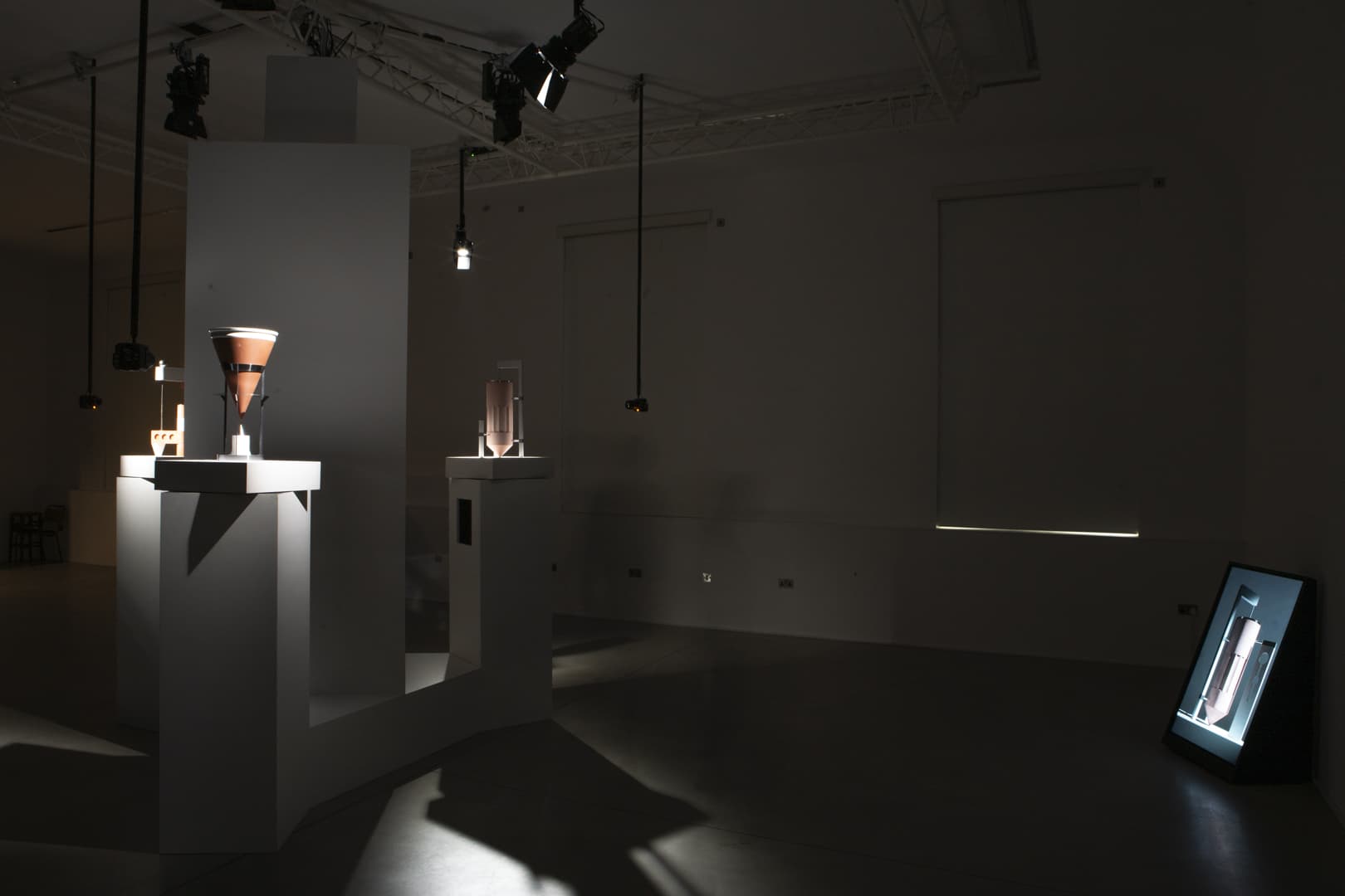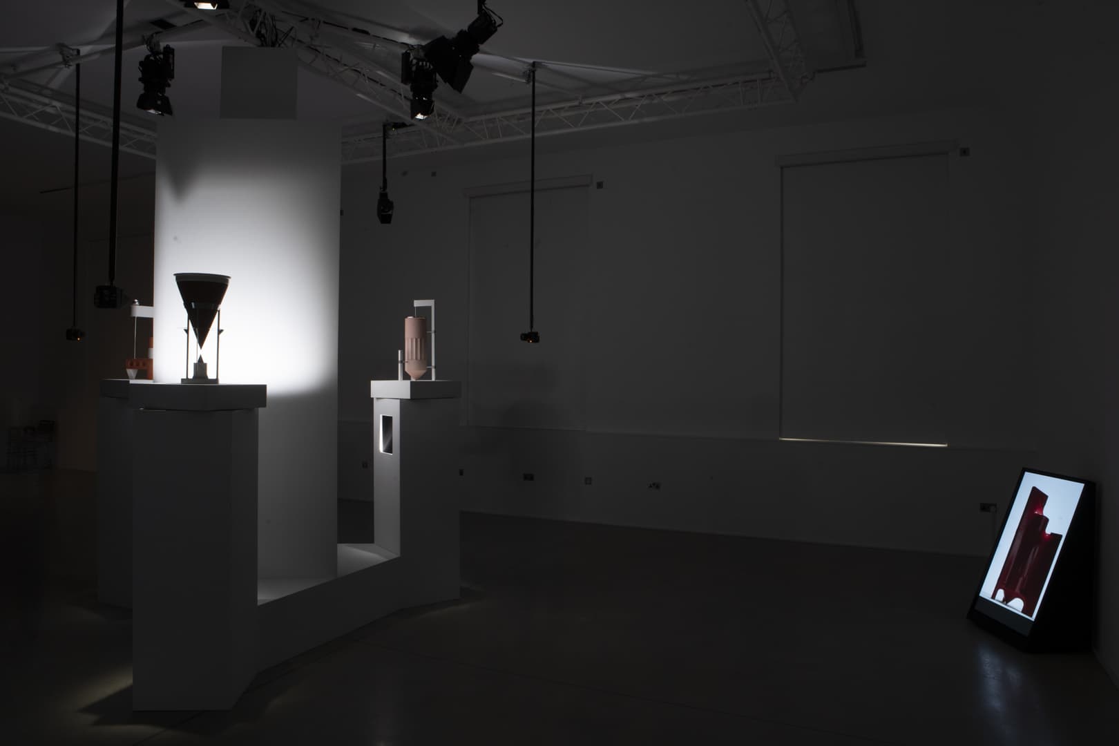 The installation is composed of three physical sculptures cycling through varying lighting environments. Fully rotatable, the objects continually transform on screens with their movements.
