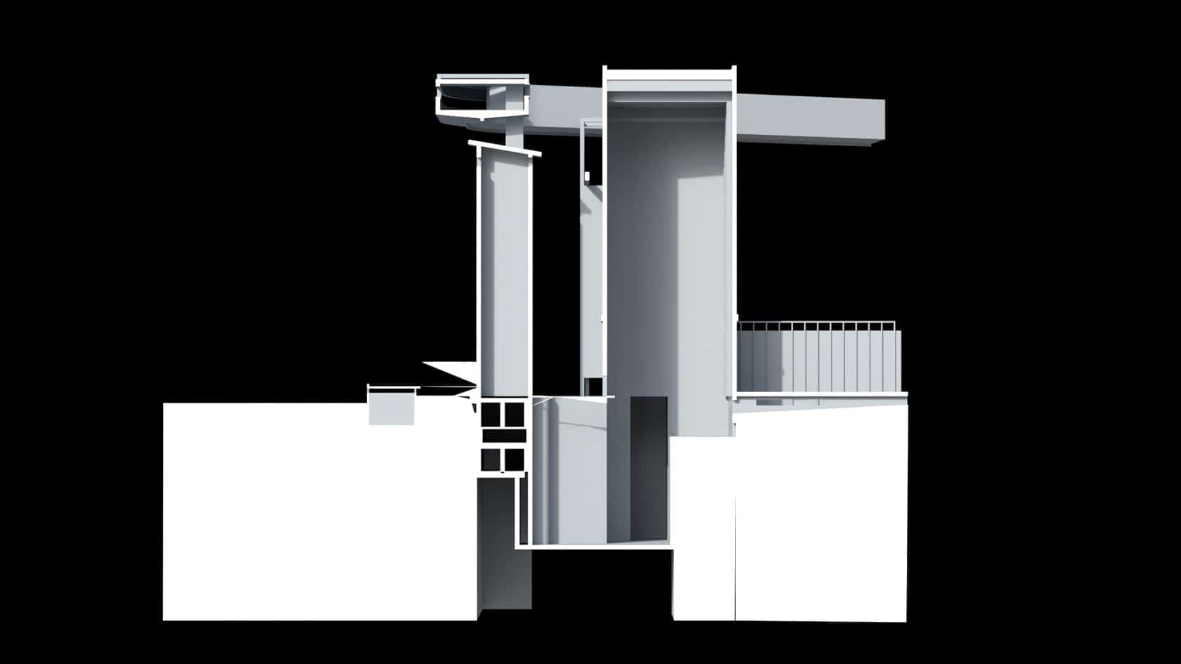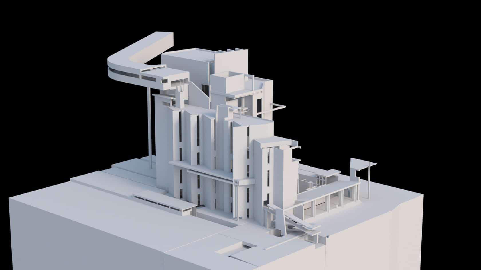 Inspired by architectural perspective illustrations first developed in the renaissance period and still used in the present day. The film adds the dimension time being compressed as we travel through the scene. The building was designed in collaboration with an architect to create a functional structure and incorporating the letter form of the ‘U’ in the final frame.